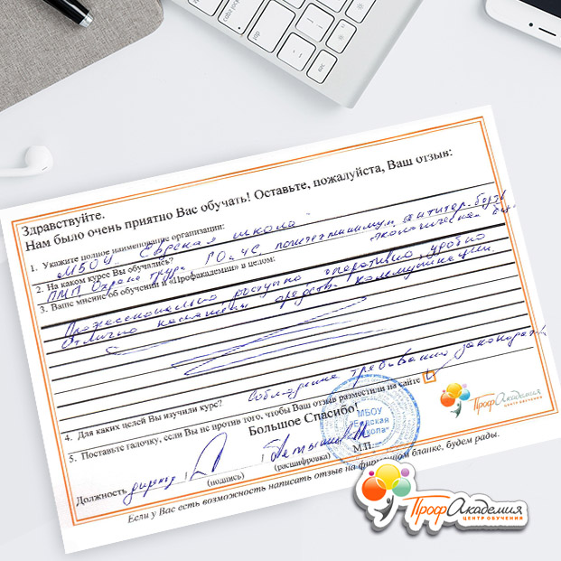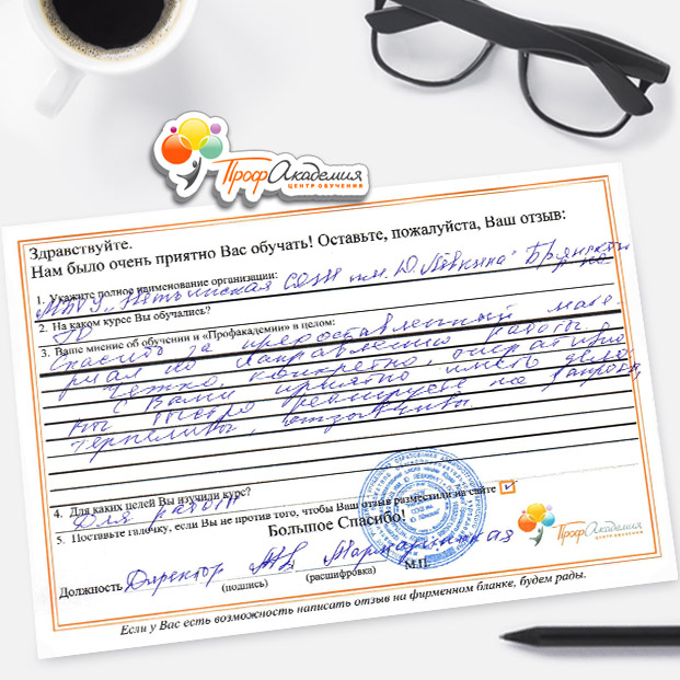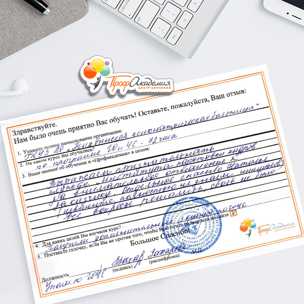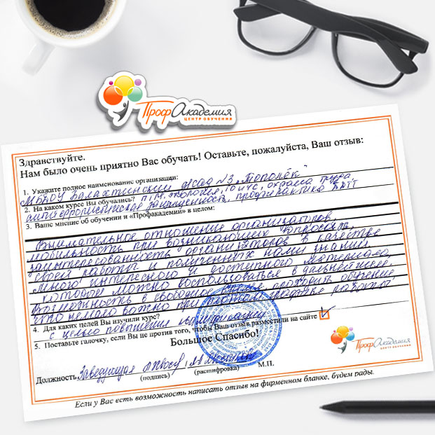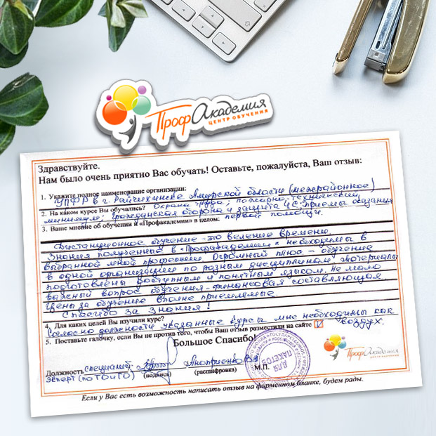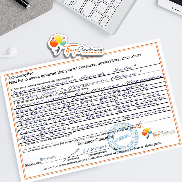 Огромное спасибо, всей команде “Профакадемии”, очень слаженная работа, быстро удобно, познавательно, есть время сделать заметки и разобраться в вопросах, узнать больше! Работаем уже несколько лет с Вами и очень довольны!!! Относитесь внимательно к любому клиенту, даже если обучается один человек, очень приятно! Спасибо всем! Процветания и стабильности