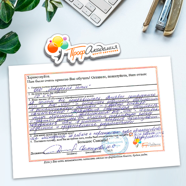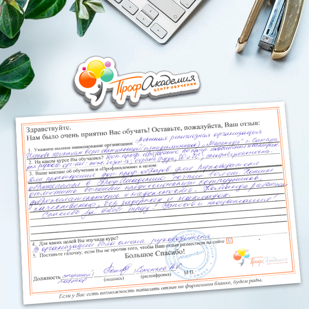 Для прохождения доп. проф. образ. для руководителя обращаемся в ПрофАкадемию почти 10 лет. Хотим отметить высокий профессионализм сотрудников, доброжелательность и надежность. Команда работает качественно, без задержек и накладок. Спасибо за ваш труд! Успехов и процветания!