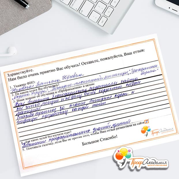 Хочу выразить благодарность, сказать большое спасибо осоюенно Синица Татьяне и команде "Профессиональная академия" за ваш труд, отзывчивость и оперативность. Я проходила обучение по нескольким курсам и всегда сотрудники были на связи, всегда разъясняли интересующие вопросы, всегда доброжелательные. Приемлемые цены, отличная работа специалиста как я уже упоминала ранее Татьяна Синица, которая четко знает свое дело. В общем одни плюсы и никакой головной боли!