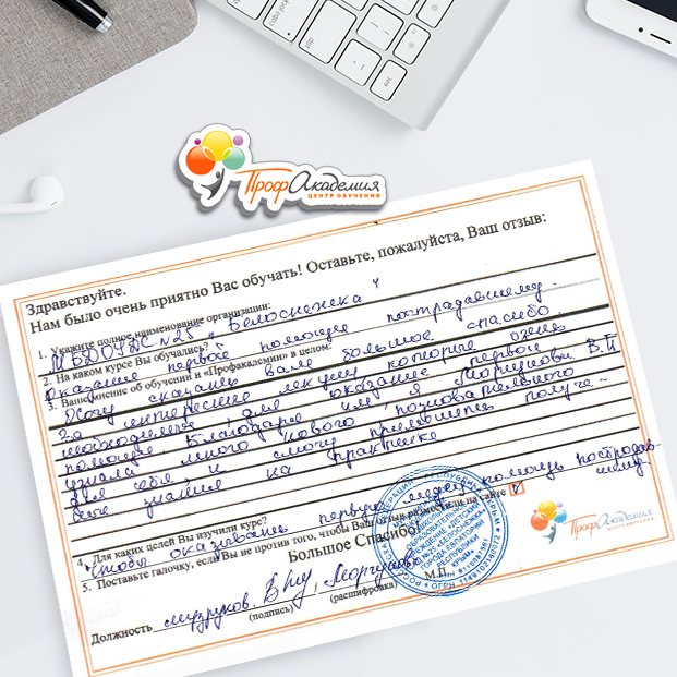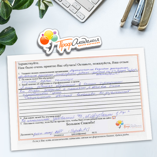 У всех педагогов нашей школы только положительные впечатления от обучения в "Профакадемии" Учебный материал очень интересный. Есть и презентации, и видеоматериалы. Все воспринимается легко и доступно. Все подтемы разложены по полочка, очень удобно для изучения! Очень вам благодарны, планируем и дальнейшее обучения в вашей Академиии.